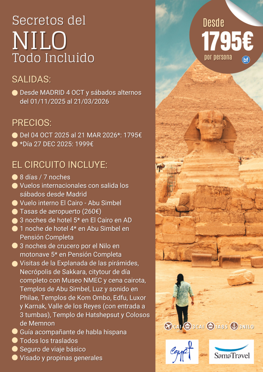 EGP "Secretos del Nilo TI " : 8 días Cairo +crucero +visitas [Desde MAD a CAI] (01nov-21mar26) *desde 1795€*