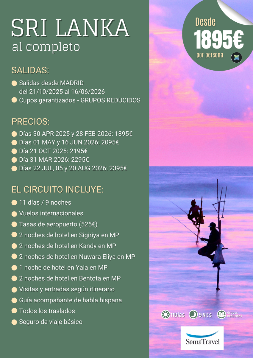 "SRI LANKA al Completo": Circuito 11 días - Cupos garantizados desde Madrid (21Oct-20Aug) **Desde 1.895€**