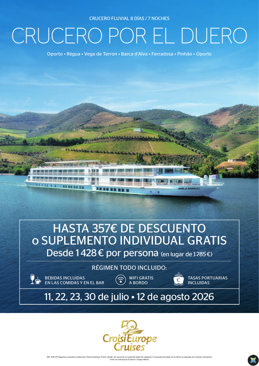 Hasta 357€ de DESCUENTO - crucero fluvial por el Duero - 8 días - régimen Todo Incluido - julio y agosto